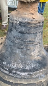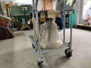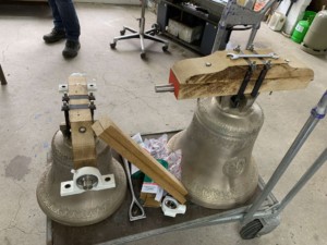 De gegoten klokken staan nu tijdelijk in het Mariakoor opgesteld totdat ze in de vieringtoren worden opgehangen.