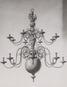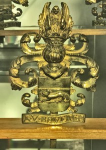 Van het begin van de zeventiende eeuw tot 1863 werd de Grote Kerk verlicht door koperen bolkronen met kaarsen. Er kwamen er in totaal twaalf te hangen in verschillende maten, met er boven op een wapenschildje van degenen die ze geschonken had: zes door A. van Beveren, twee door J. van Beveren en vier door A. van Bleijenburg. In 1863 werd overgestapt op nieuwe verlichting in de vorm van zinken gaskronen. De bolkronen werden verkocht, de wapenschildjes verdwenen in het archief van het Dordrechts Museum. Ruim anderhalve eeuw later zijn ze nu (permanent) terug in de kerk. (Foto’s Herman van Duinen)