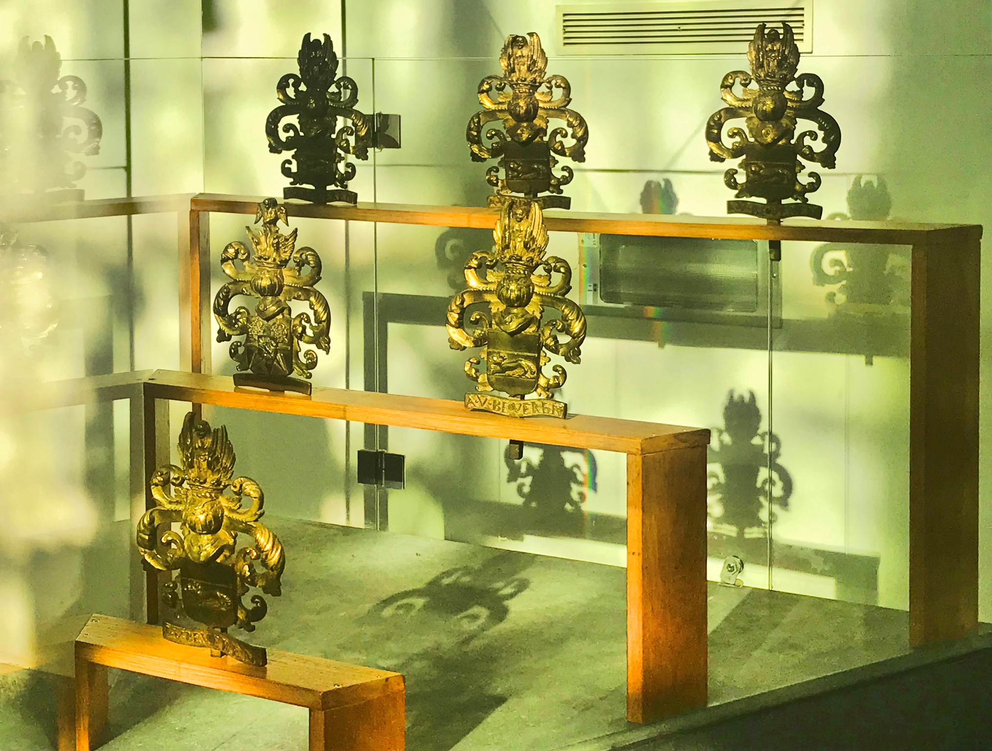 Van het begin van de zeventiende eeuw tot 1863 werd de Grote Kerk verlicht door koperen bolkronen met kaarsen. Er kwamen er in totaal twaalf te hangen in verschillende maten, met er boven op een wapenschildje van degenen die ze geschonken had: zes door A. van Beveren, twee door J. van Beveren en vier door A. van Bleijenburg. In 1863 werd overgestapt op nieuwe verlichting in de vorm van zinken gaskronen. De bolkronen werden verkocht, de wapenschildjes verdwenen in het archief van het Dordrechts Museum. Ruim anderhalve eeuw later zijn ze nu (permanent) terug in de kerk. (Foto’s Herman van Duinen)