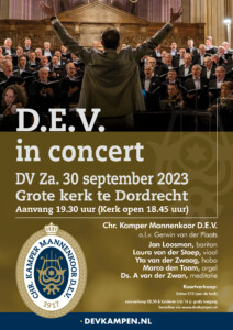 Het Christelijk Kamper mannenkoor D.E.V geeft op zaterdag 30 september een concert in de Grote Kerk. Medewerking verlenen Jan Loosman – Bariton, Laura van der Stoep op Viool, Yta van der Zwaag op Hobo, en Marco den Toom bespeelt het orgel. Het geheel staat o.l.v. Gerwin van der Plaats.
