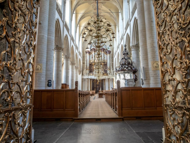 De eerste foto is symbolisch voor deze tijd. Je ziet vanuit het hoogkoor het lege schip van onze kerk. Het koperen koorhek is weliswaar geopend, maar je bevriest als het ware tussen de koperen deuren. De blik gaat als een magneet naar het lichte koor, alsof je weet: daar gebeurt het. Het schip van de kerk ademt in een prachtig licht. Dat licht is het geheim. Wij weten immers God zelf is het licht en in hem is in het geheel geen duisternis (1 Johannes 1,5).